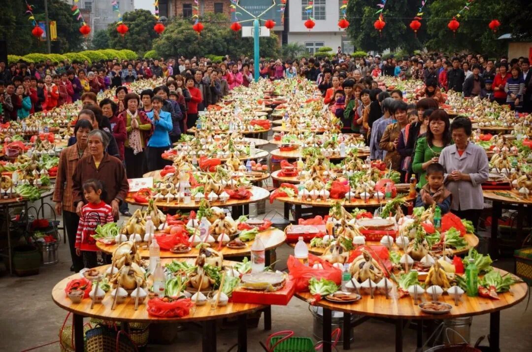 从正月初二起,各村秩序“作念年例”,家家户户杀鸡宰鹅、蒸扣肉、炸虾饼,摆上十碗八碟的“九大簋”宴席,宴请九故十亲。这种土豪式的宴请是独属于粤西的年味。