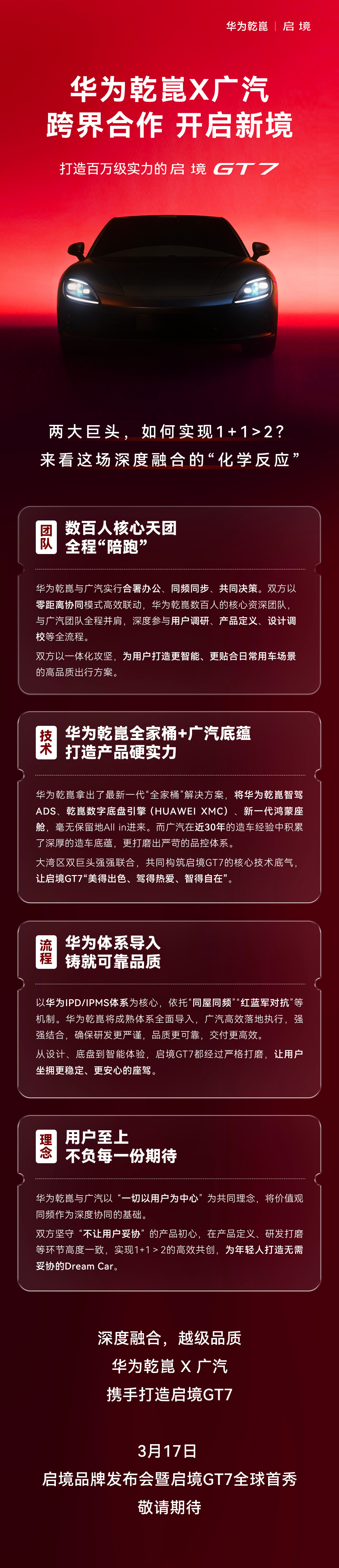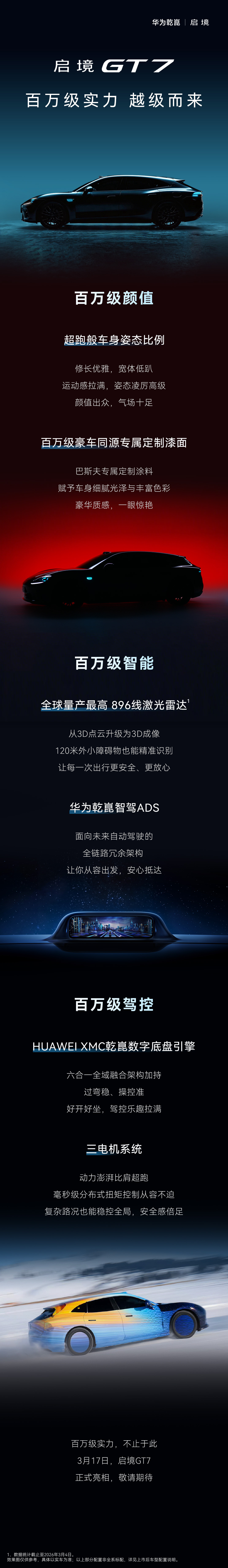 IT之家 3 月 16 日音信,今天上昼,启境汽车官微发文晓谕,由华为乾崑、广汽深度会通联袂打造的“百万级实力”车型启境 GT7 将于 3 月 17 日各人首秀。