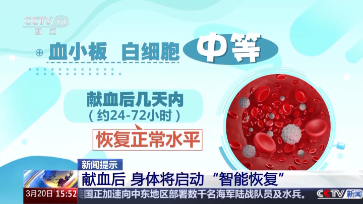 血小板和白细胞规复速率中等:在献血后几天内(约24—72小时)就能规复到平素水平。